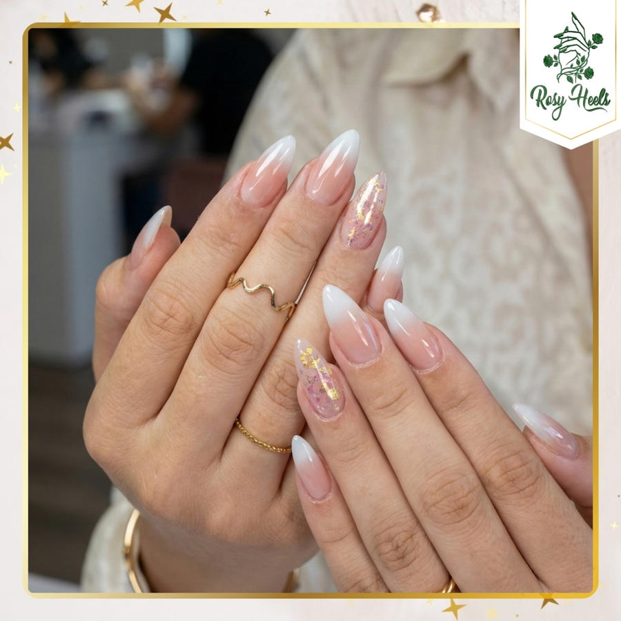 One of the most requested looks at Rosy Heels is the modern update on the classic French tip—white tips paired with a thin outline of color or a soft nude base enhanced with subtle accents.